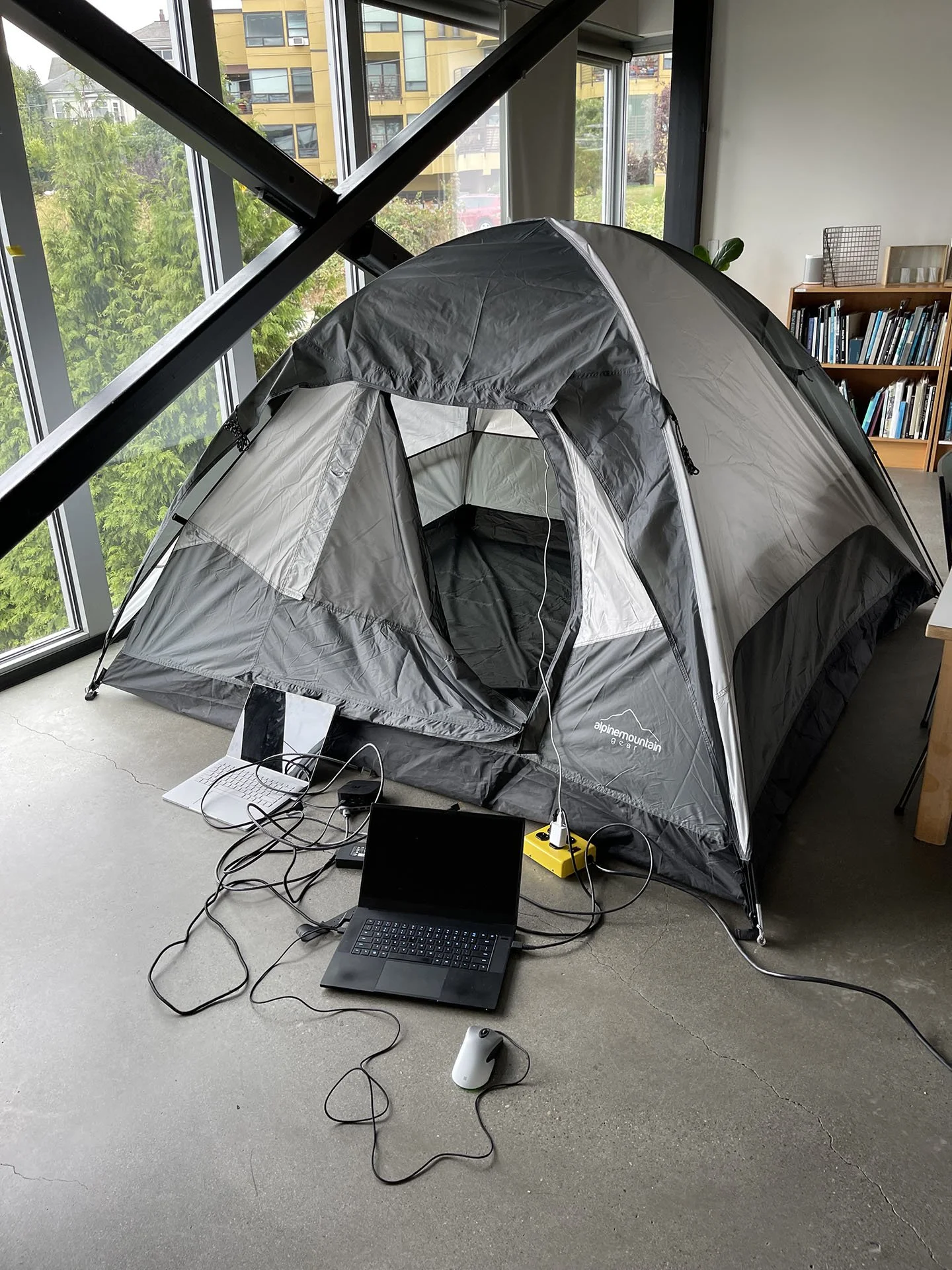 A collaboration with Facing Homelessness, The View From Here shone a light on neighbors who lived unsheltered. In this installation, one could glimpse loved ones sharing meals, parents putting a baby to sleep, or beloved dogs getting their ears scratched. Yet, these familiar scenes often seemed out of place inside the flimsy fabric walls of a tent.