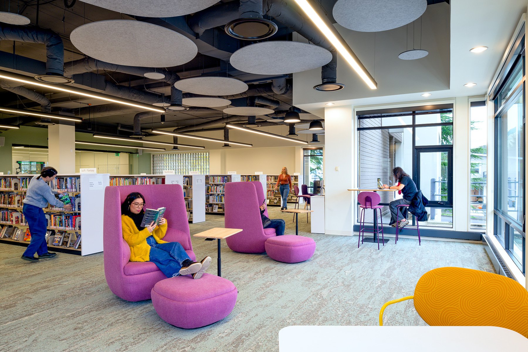 When a broken irrigation pipe on the library’s green roof caused catastrophic flooding, the Edmonds Library was forced to close unexpectedly. Sno-Isle Libraries turned this setback into an opportunity, reimagining the entire facility with updated systems, finishes, and furnishings. Within the same footprint, the library has been completely transformed: a serene palette of water-inspired neutrals, infused with light, color, and comfort, celebrates its Puget Sound setting.