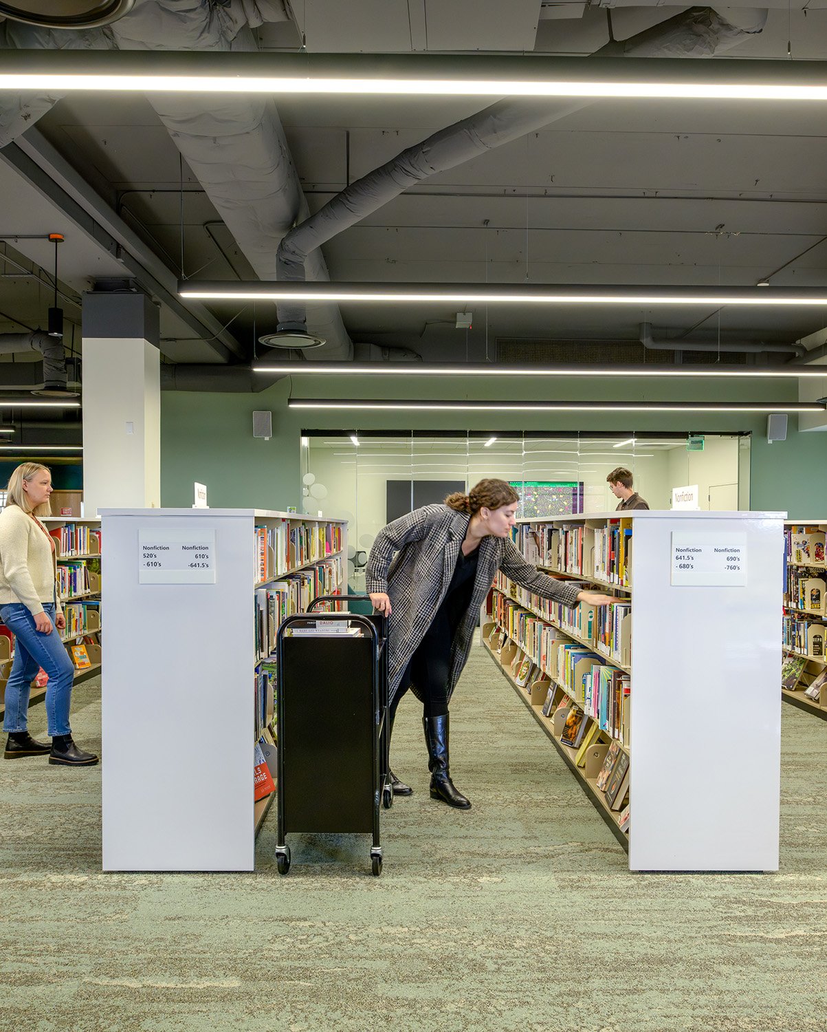 A new community room with operable glass doors opens to the library for large events or closes for storytime, book clubs, and small-group meetings.