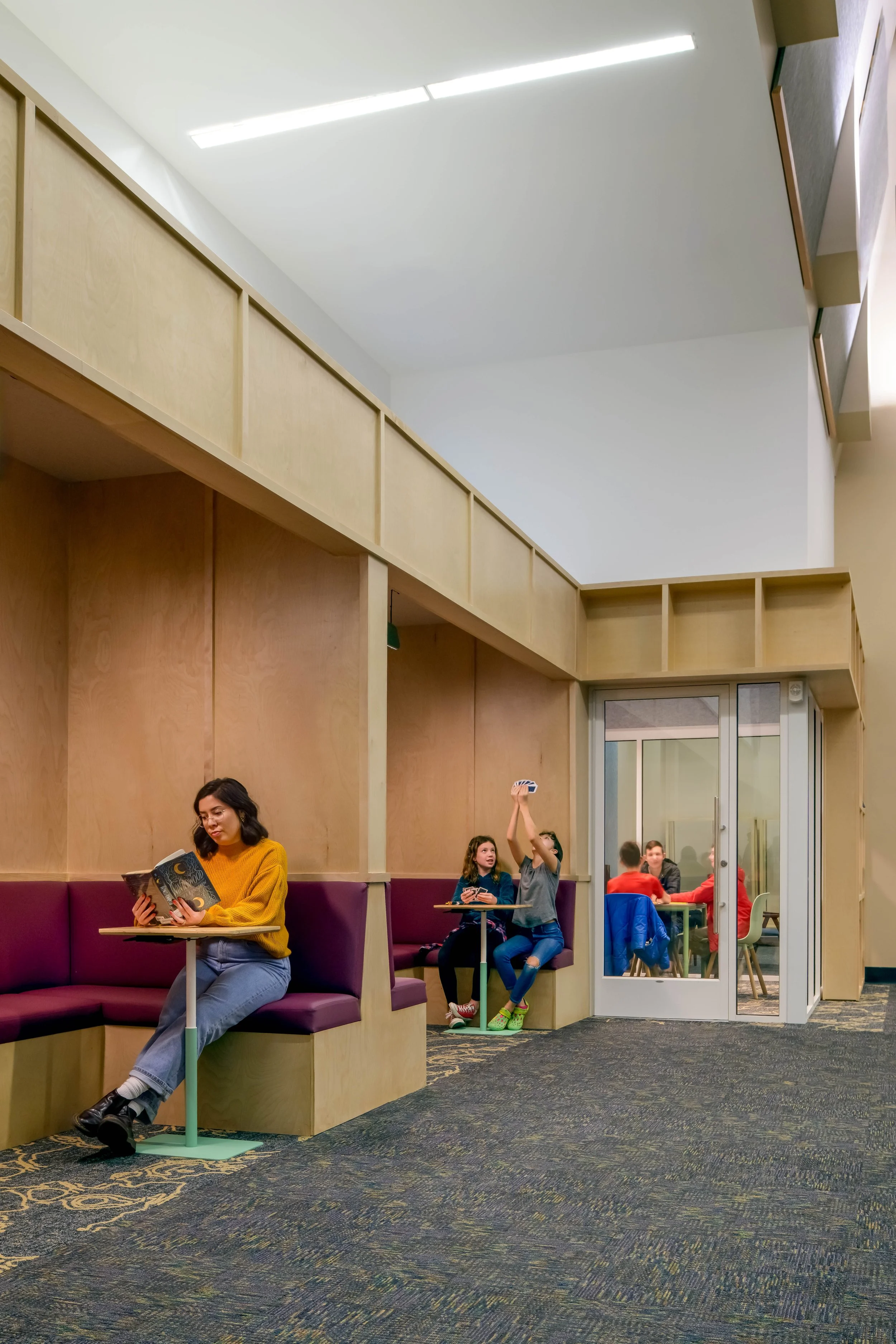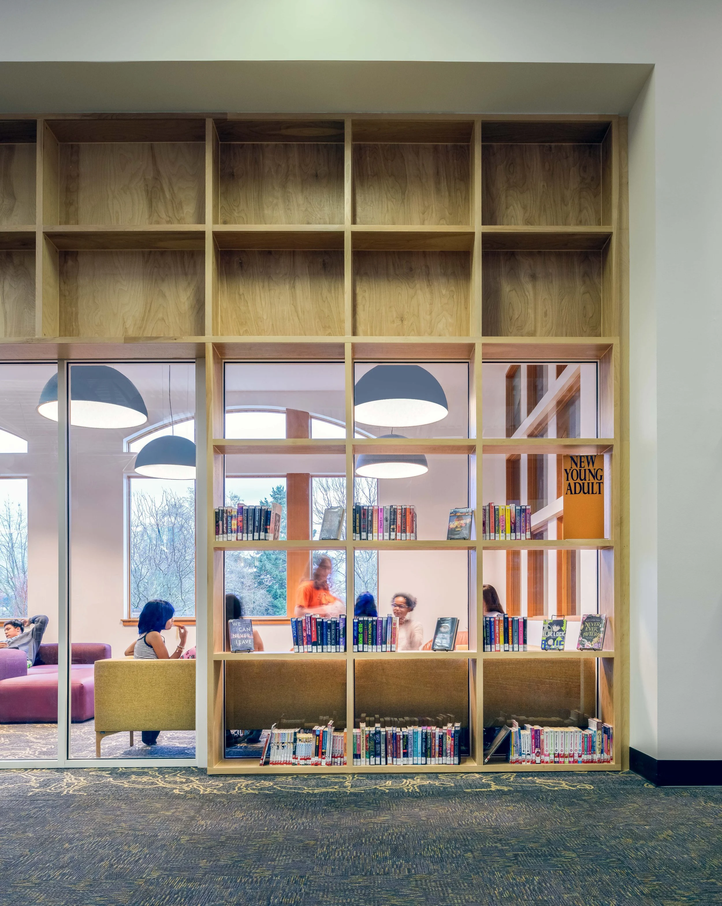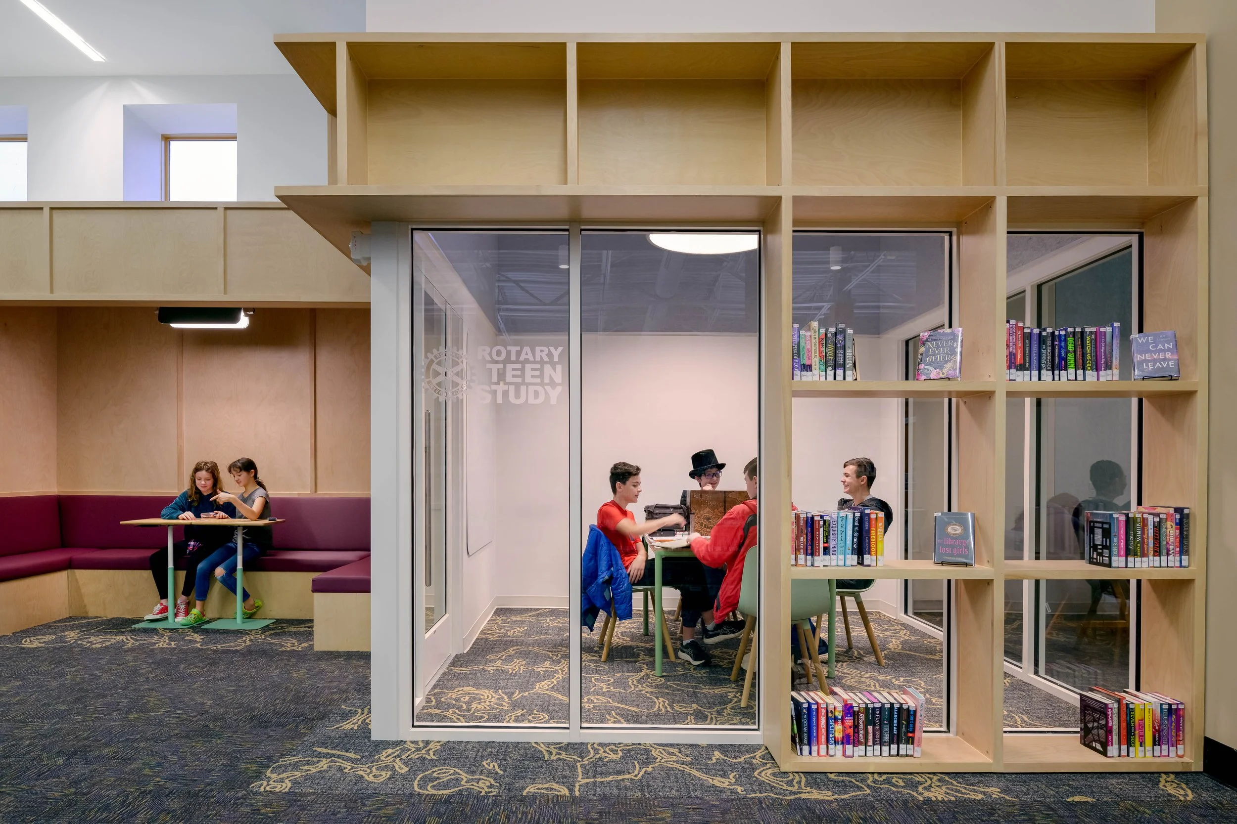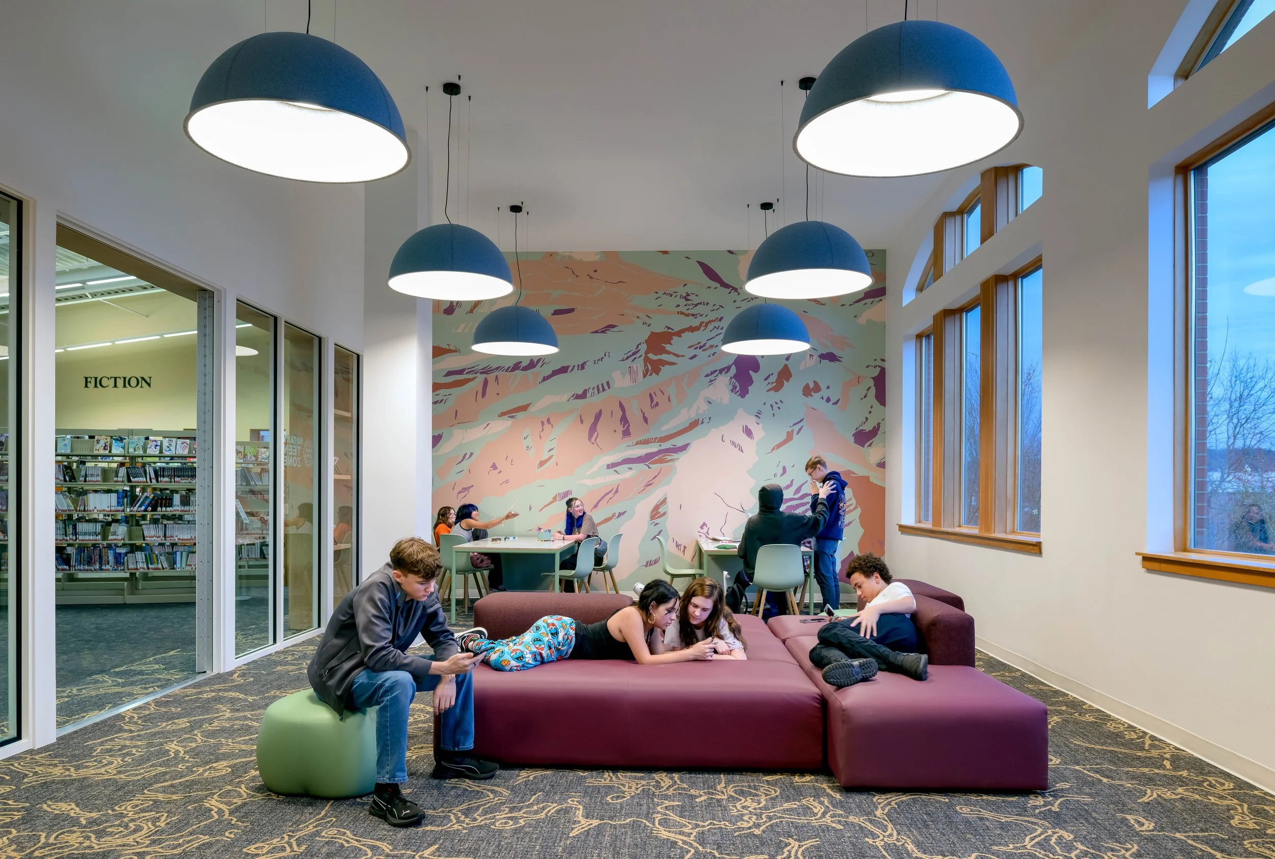A transparent glass wall defines the Teen Zone, offering acoustic separation while maintaining visual connection to the rest of the library. It keeps sightlines open for staff and gives teens a sense of ownership and safety.
