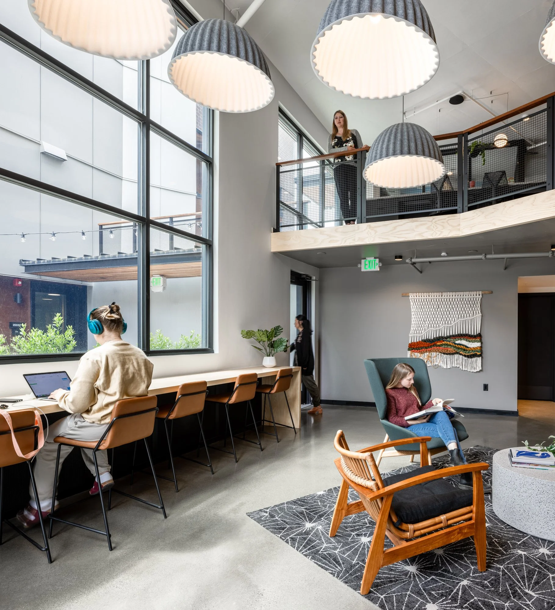 Columbia City is known for its walkable fabric and informal cut-throughs, a quality carried into Alta Arlo’s design. Two southwest-facing public plazas along Rainier create welcoming “community living rooms” and extend the retail frontage along the street. From the southern courtyard, visitors can glimpse the central residential courtyard, maintaining privacy for residents while preserving visual connection. A through-block passage links Rainier Avenue and S Alaska Street and includes commercial office space, an amenity much needed in the neighborhood.