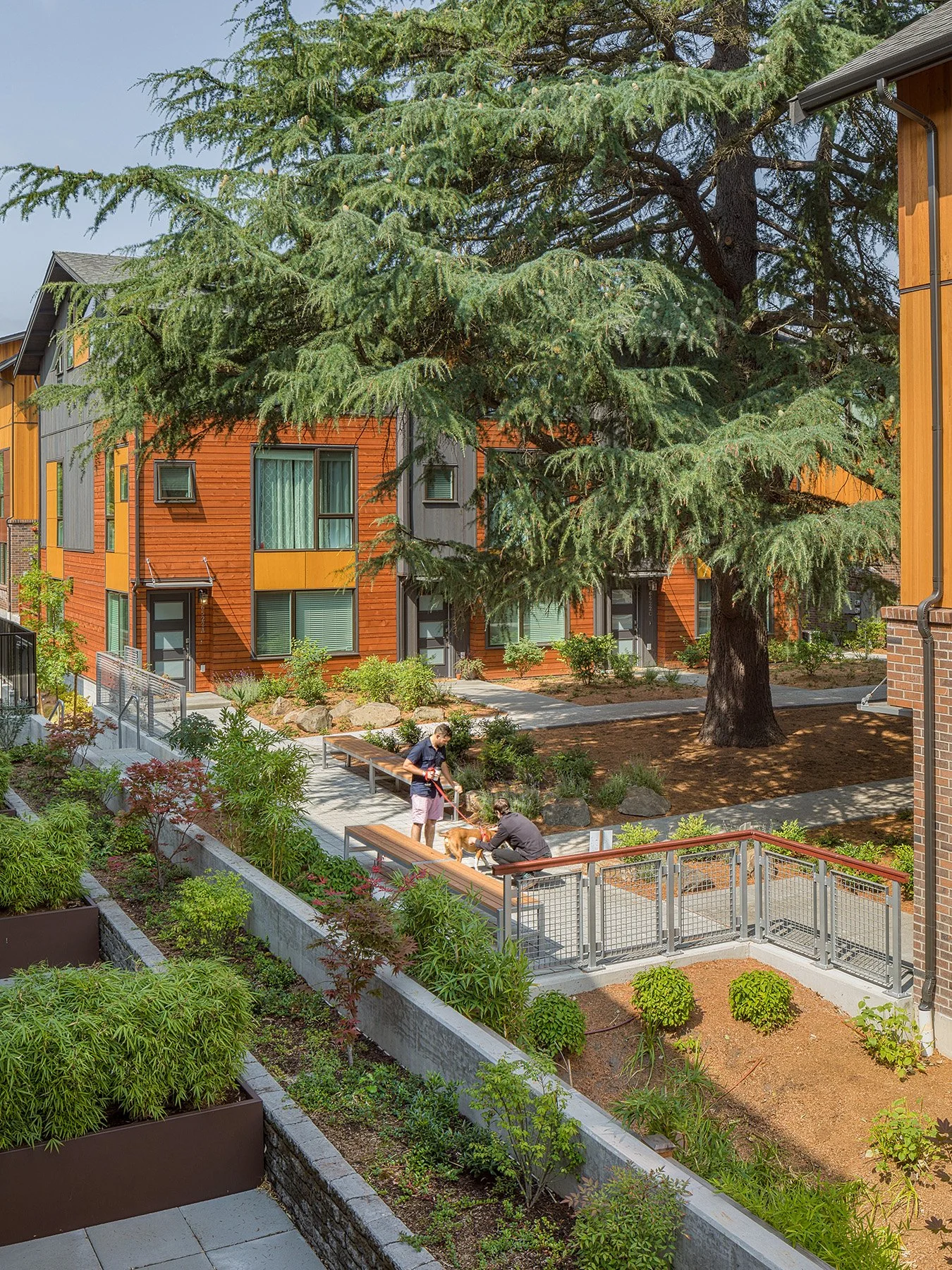 Bryant Heights spans an entire city block in North Seattle, transitioning from Single Family to Neighborhood Commercial zoning. After years of vacancy, the pastoral character of the site had evolved into a beloved informal park. This communal, park-like atmosphere became the guiding inspiration for the new development.