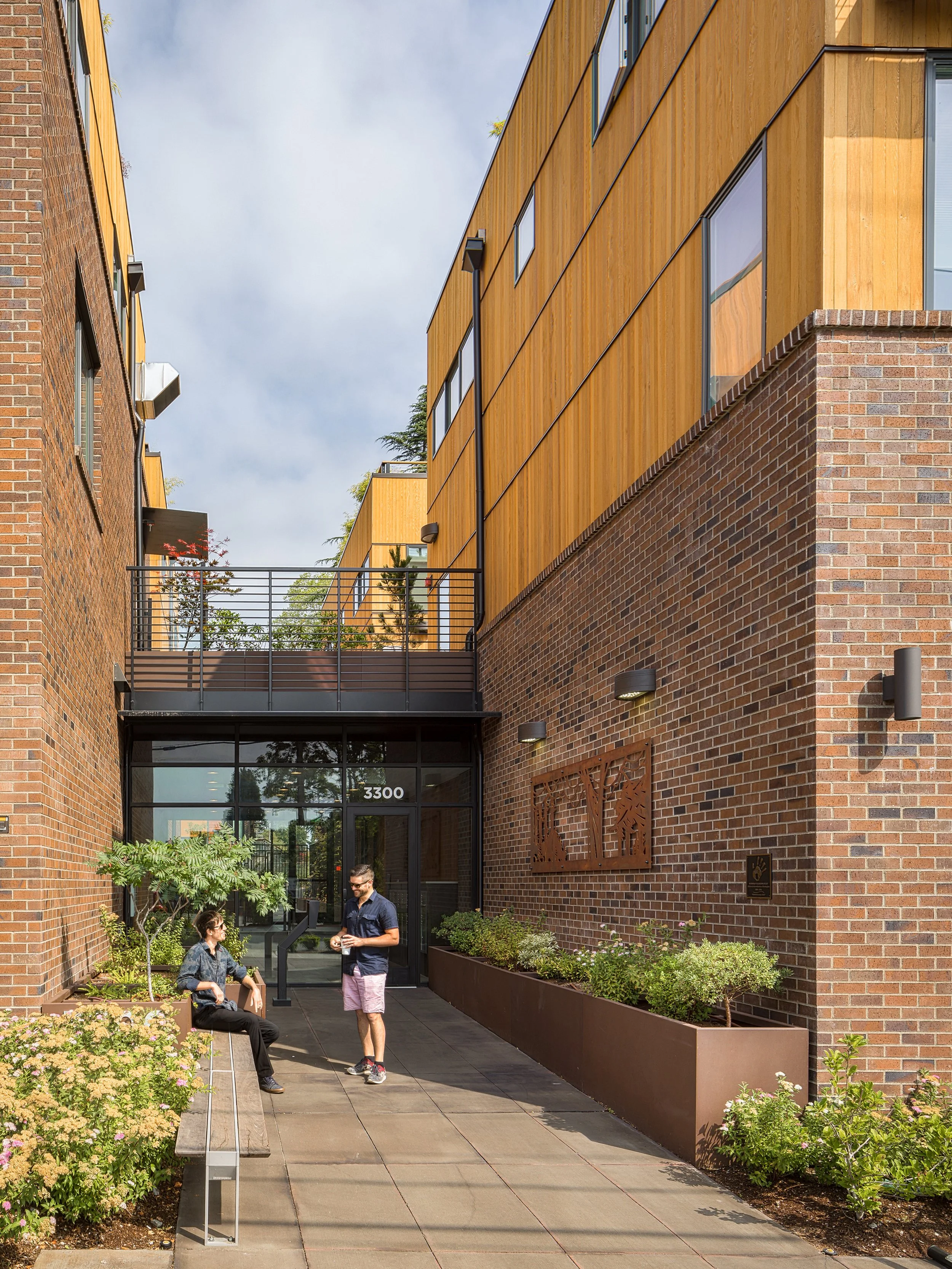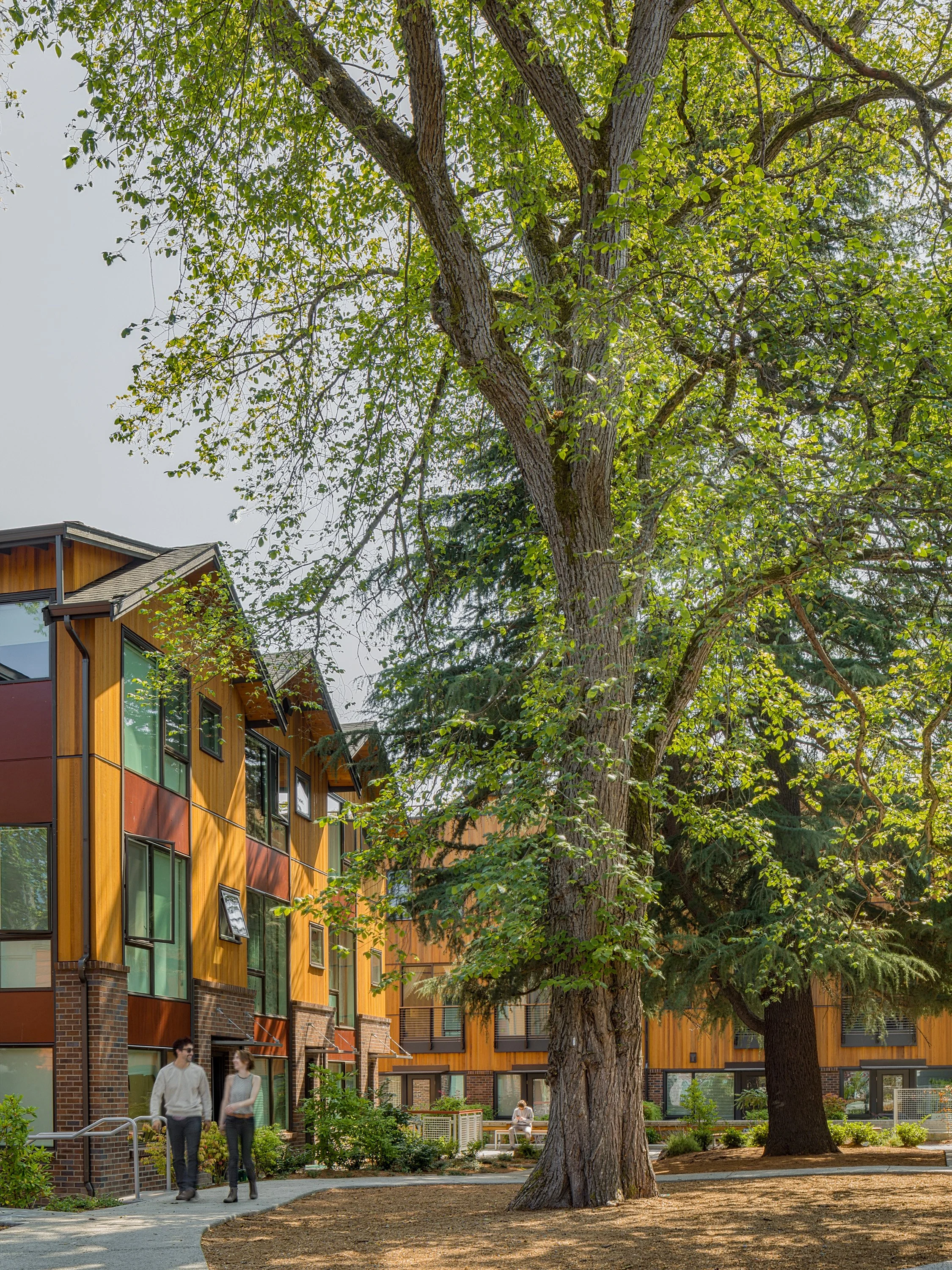 Buildings were carefully arranged around the site’s exceptional trees, establishing an immediate sense of place and permanence. A mix of brick, wood, and panel siding, along with varied rooflines, creates a balance of cohesion and diversity across the development.