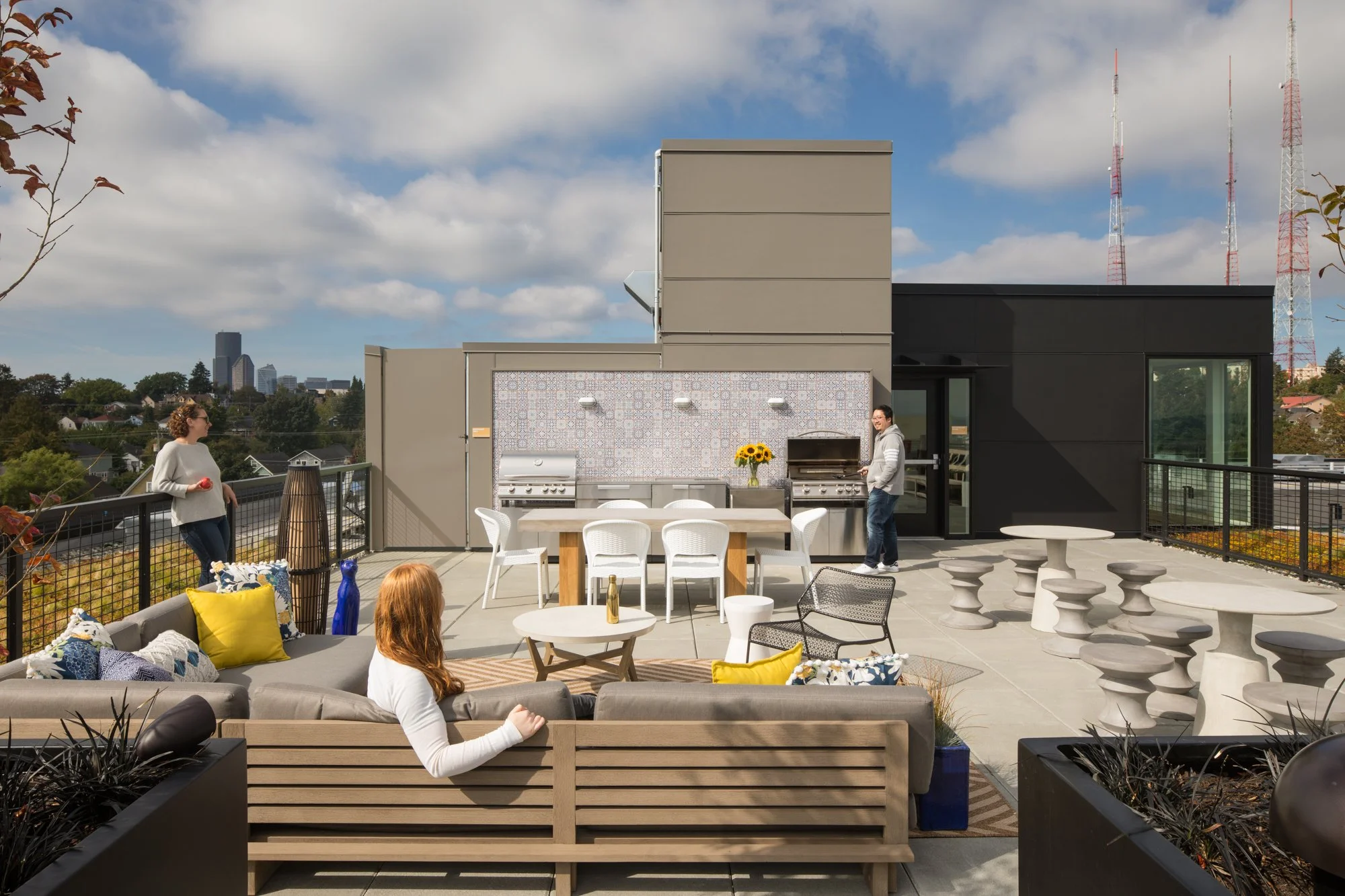 Community spaces throughout the building, including the lounge, courtyard terrace, and roof deck, offer comfortable furniture, a fire pit, and multiple barbeque and picnic areas, encouraging residents to gather and connect.