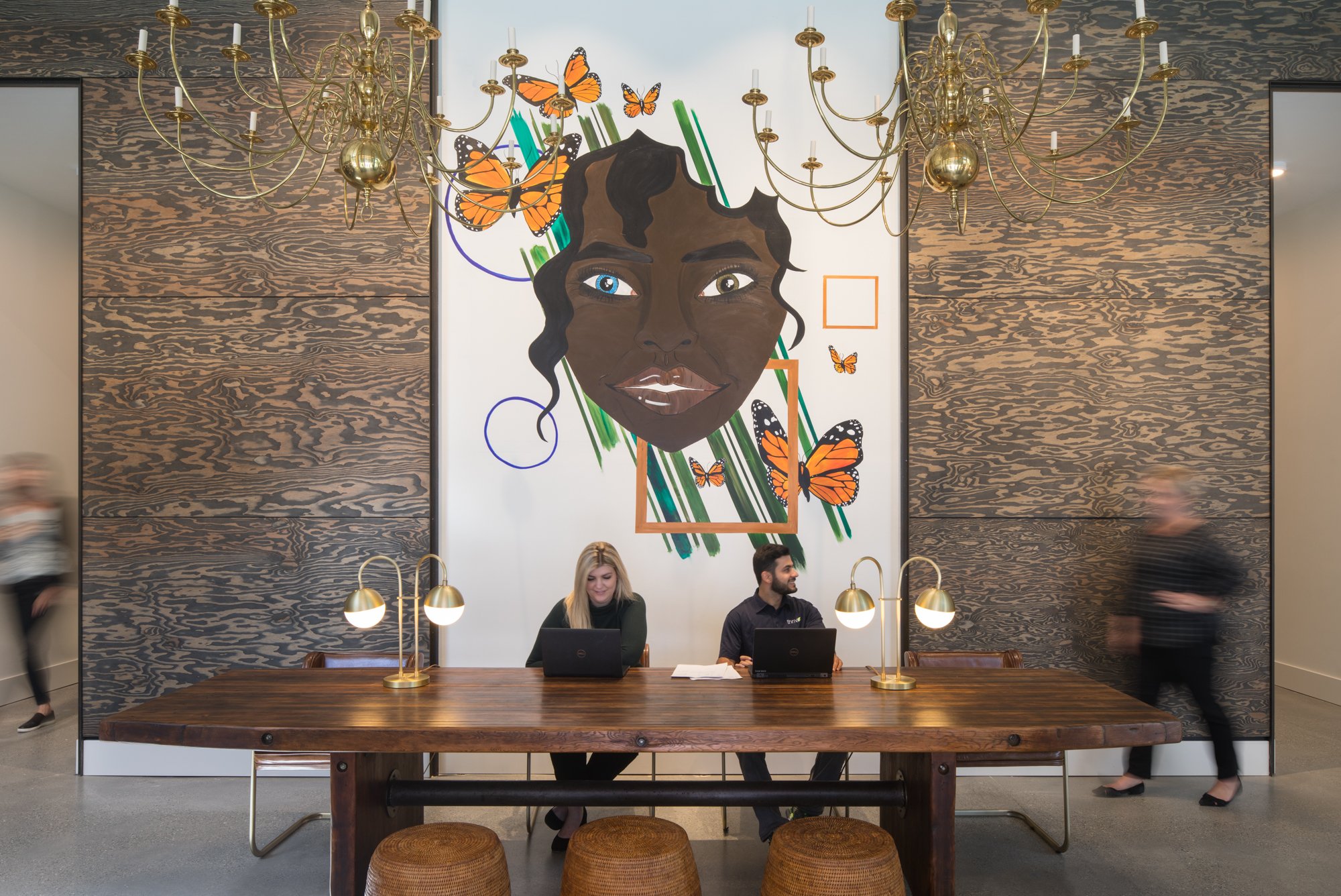 The lobby draws inspiration from the 1970s with a relaxed mix of new and vintage pieces, blending atomic-era design with eclectic bohemian touches. Highlights include two sculptural brass chandeliers salvaged from a historic Seattle restaurant and a large mural by a neighborhood artist that greets residents at the entry.