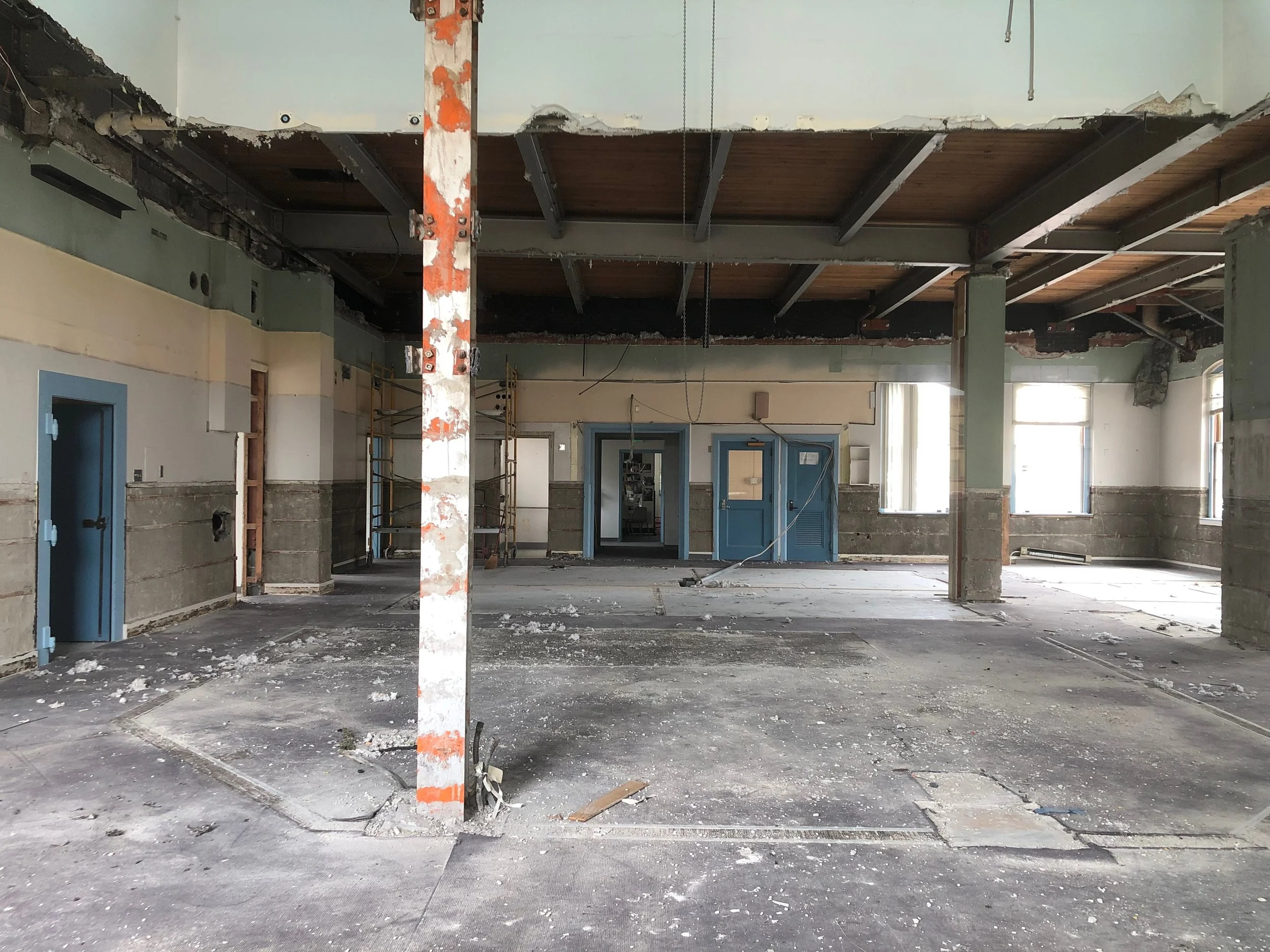 The removal of the plaster ceiling unexpectedly revealed an original steel superstructure and wooden slat ceilings, which are now exposed on the interior.