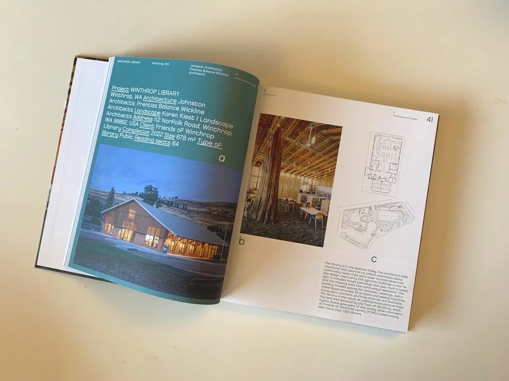 "Inspired by the agrarian buildings in the region, [the Winthrop Library] includes broad overhangs and open roof trusses, and the massing suits the community's aesthetic."