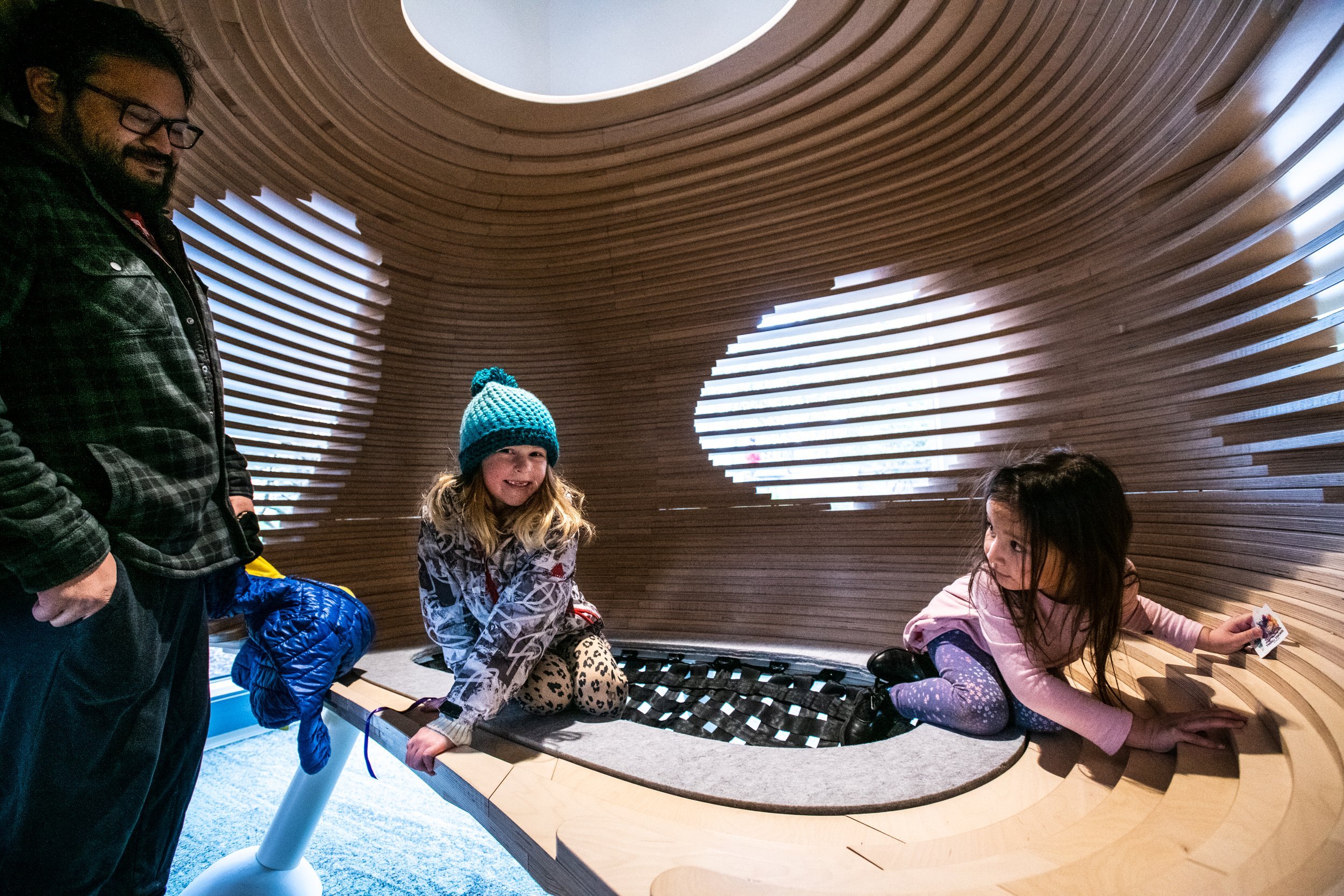 The floor-to-ceiling pegboard, which is essentially a large version of a Lite-Brite toy, was crafted by JA design technologist and associate Shane Leaman and creatively infuses dynamic movement and experiential design. The board encourages cooperative play and problem-solving via shifting lights and the addition and removal of pegs, showing how technology, especially when combined with tactical elements, can enhance a child's learning experience and ignite imaginative play.