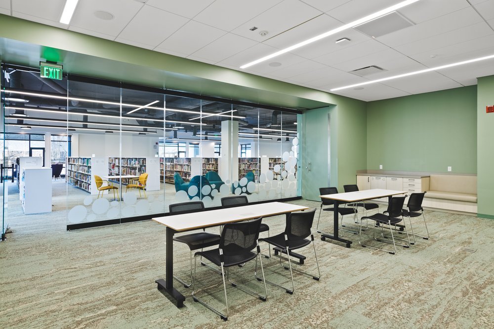 The community room is created via a glass Nanawall that can be folded away to open the room to the rest of the library.