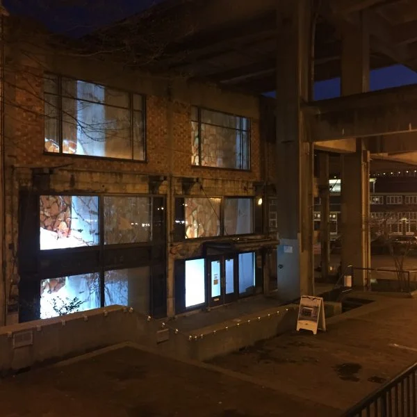 We were approached by our friends at Friends of the Waterfront Seattle with a need for a quick installation that would animate an old vacant facade at the foot of the Pike Place Hill Climb, across Alaska Way from the Seattle Aquarium. The Bakun Building has been a fixture on the Seattle waterfront since 1925. The viaduct, built directly over its northwest corner, has been a too cozy neighbor since its completion in 1951. The building is owned by the Washington Department of Transportation, who is currently looking for a tenant. The large shadow cast over the open spaces around the unoccupied building by the viaduct and increased crime, primarily at night when pedestrian traffic fades, drove the Friends of the Waterfront Seattle to create a safer, welcoming space that would deter threatening activities.