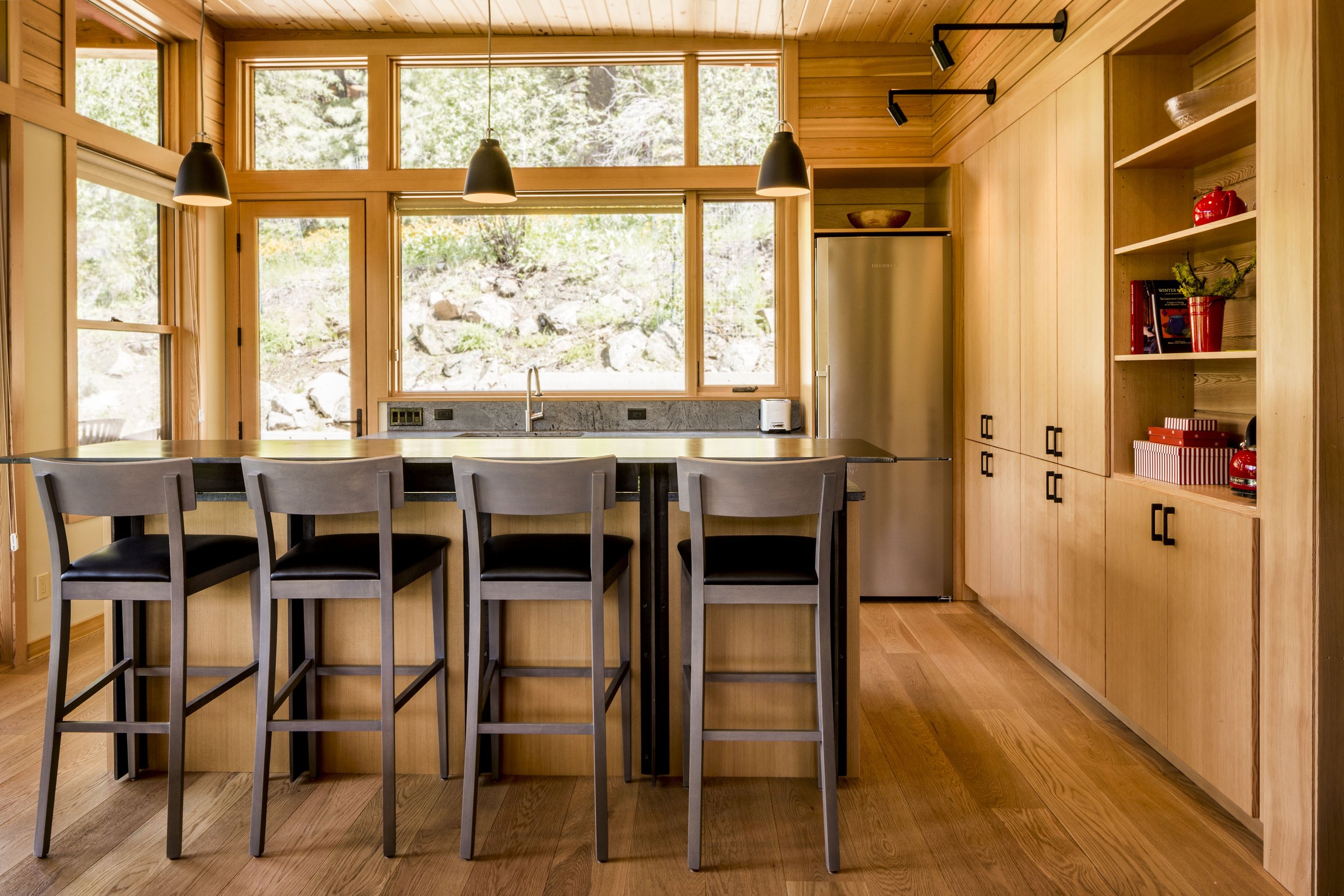 Tucked against Flagg Mountain in Mazama, WA. It looks out upon the meadow towards the North Cascades. Its form rises up to capture the view and to achieve a sense of living in and around the mountains.