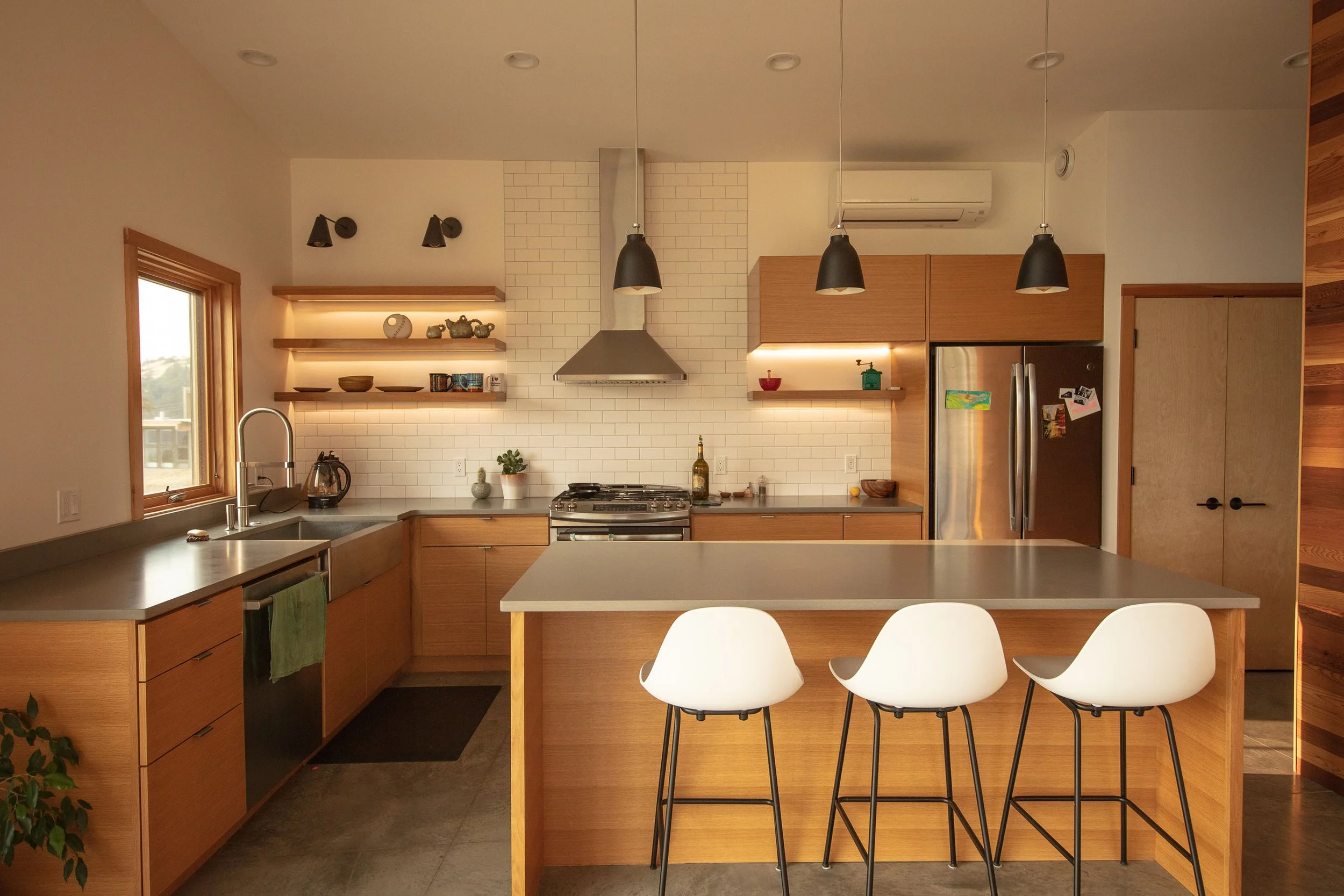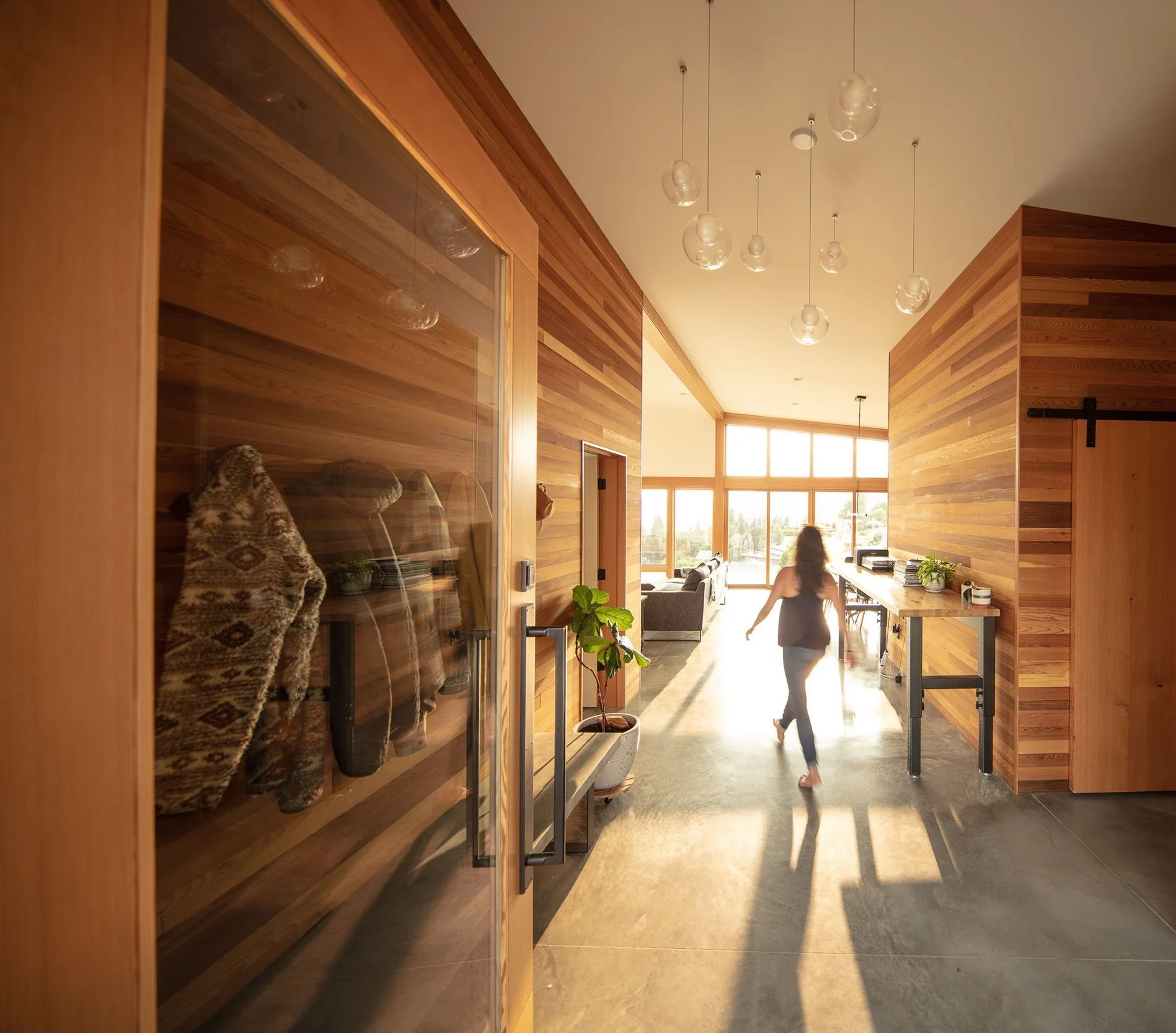 The clients, both experienced kayakers, collaborated closely on a plan that is both practical and poetic. At the center of the house, a cedar-clad utility core interrupts the primary axis. Kitchen, dining, and living spaces, along with the main circulation spine, pivot around this element, echoing the way a kayaker moves around an obstacle in a river.
