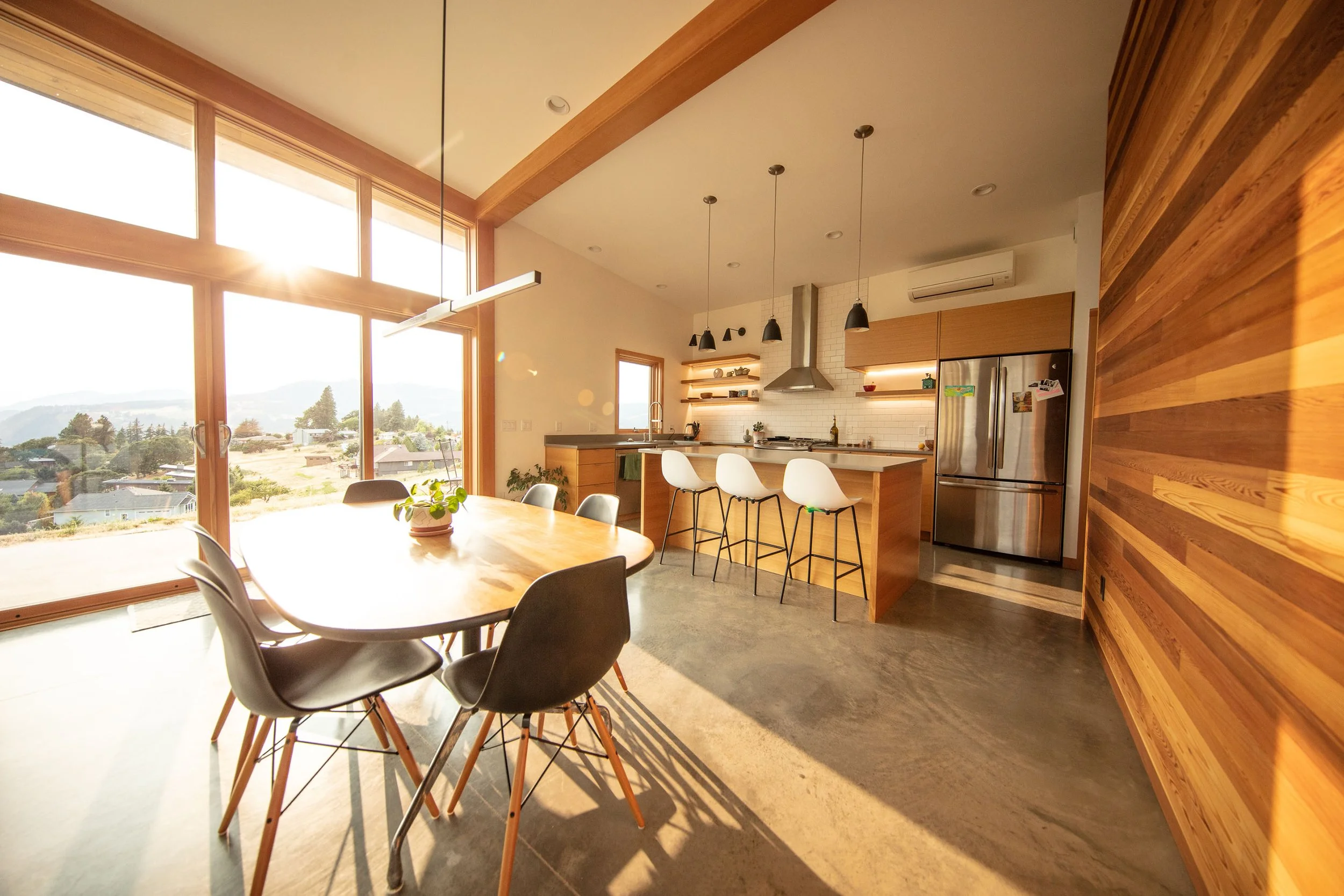 The White Salmon House is oriented to long views over the Columbia River as it moves through the Gorge, with forested foothills rising to the east. The siting and plan are shaped by these conditions, drawing the main living spaces into a clear, continuous sequence.