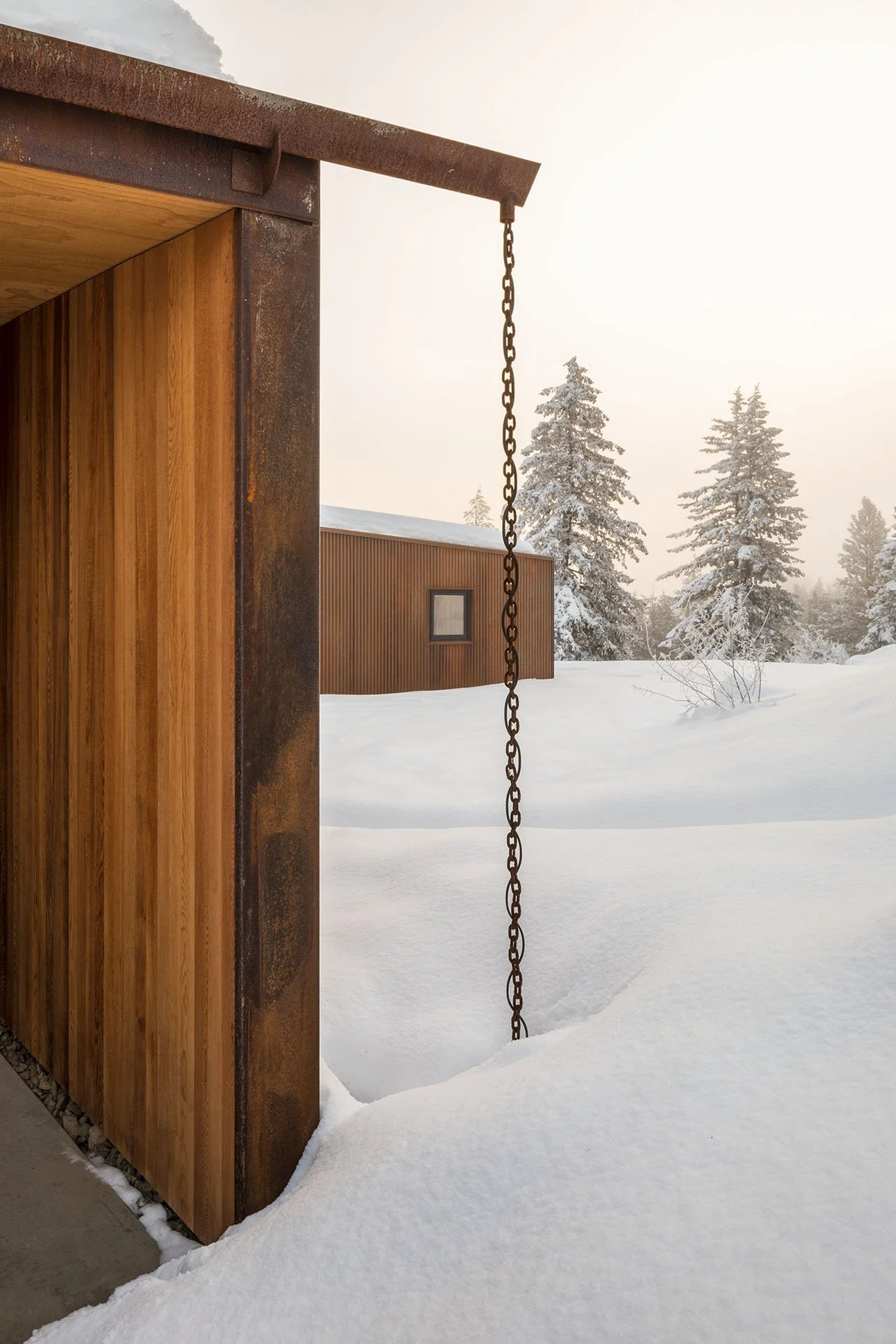 Exterior materials respond directly to the Methow Valley’s climate. Corrugated steel siding is selected for durability in hot summers and cold winters, while Western Red Cedar is used in protected areas beneath roof overhangs, where it will weather more slowly and relate to the surrounding forest.