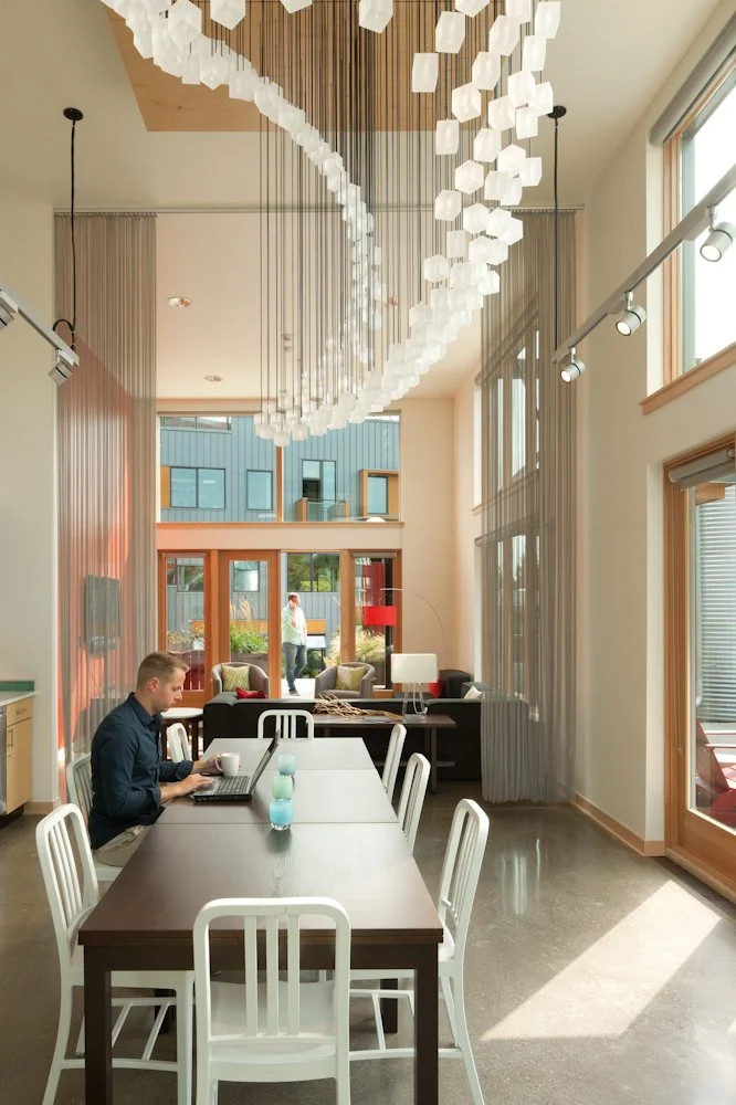 Featuring sunshades, light shelves, and operable windows, the office spaces were designed around passive daylighting and ventilation. A central atrium allows daylight into the center of the floorplate, passive ventilation through operable roof monitors, and houses an indoor garden for staff to enjoy nature during their workday. A rooftop garden provides additional gathering space. The office building features an open steel structure, chosen for its open quality and long-term lifespan.